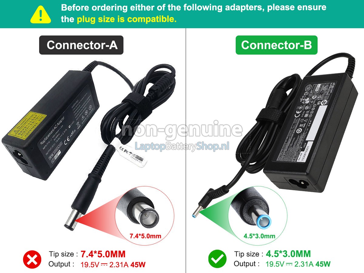 Please check the model and shape of your HP 45W 19.5V-2.31A 100-240V~1.5A 50/60HZ original adapter(use Ctrl + F to search the model). Make sure you get the correct adapter.