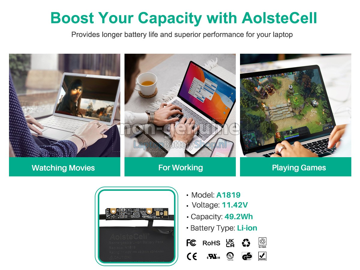 We have strict requirements on the product performance and safety. The Apple MLH12LL/A battery must go through a series of rigorous quality inspections and safety tests. In addition, our Apple MLH12LL/A replacement battery is sold directly on laptopbatteryshop.nl, so the price is about 20-50% lower than that of other middlemen and physical shops.