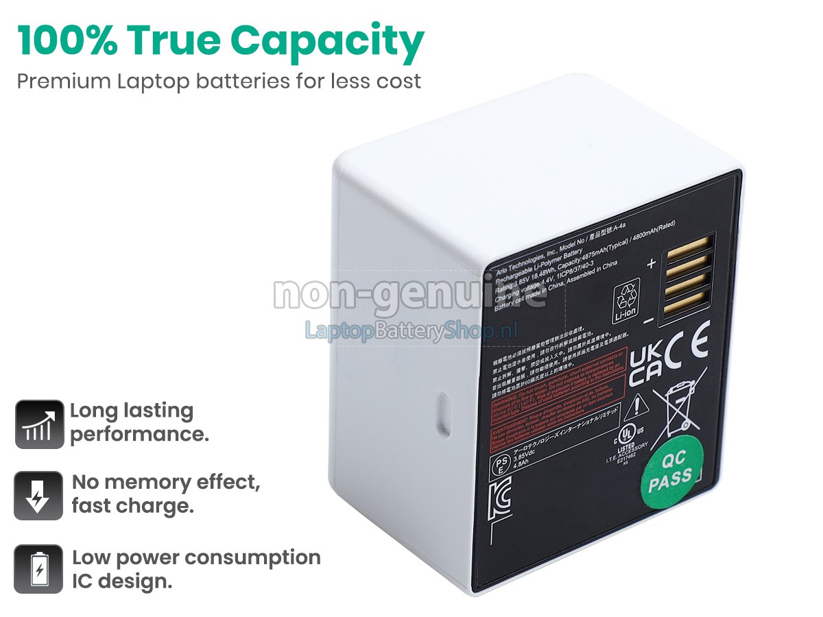 We have strict requirements on the product performance and safety. The Arlo PRO 4 battery must go through a series of rigorous quality inspections and safety tests. In addition, our Arlo PRO 4 replacement battery is sold directly on laptopbatteryshop.nl, so the price is about 20-50% lower than that of other middlemen and physical shops.