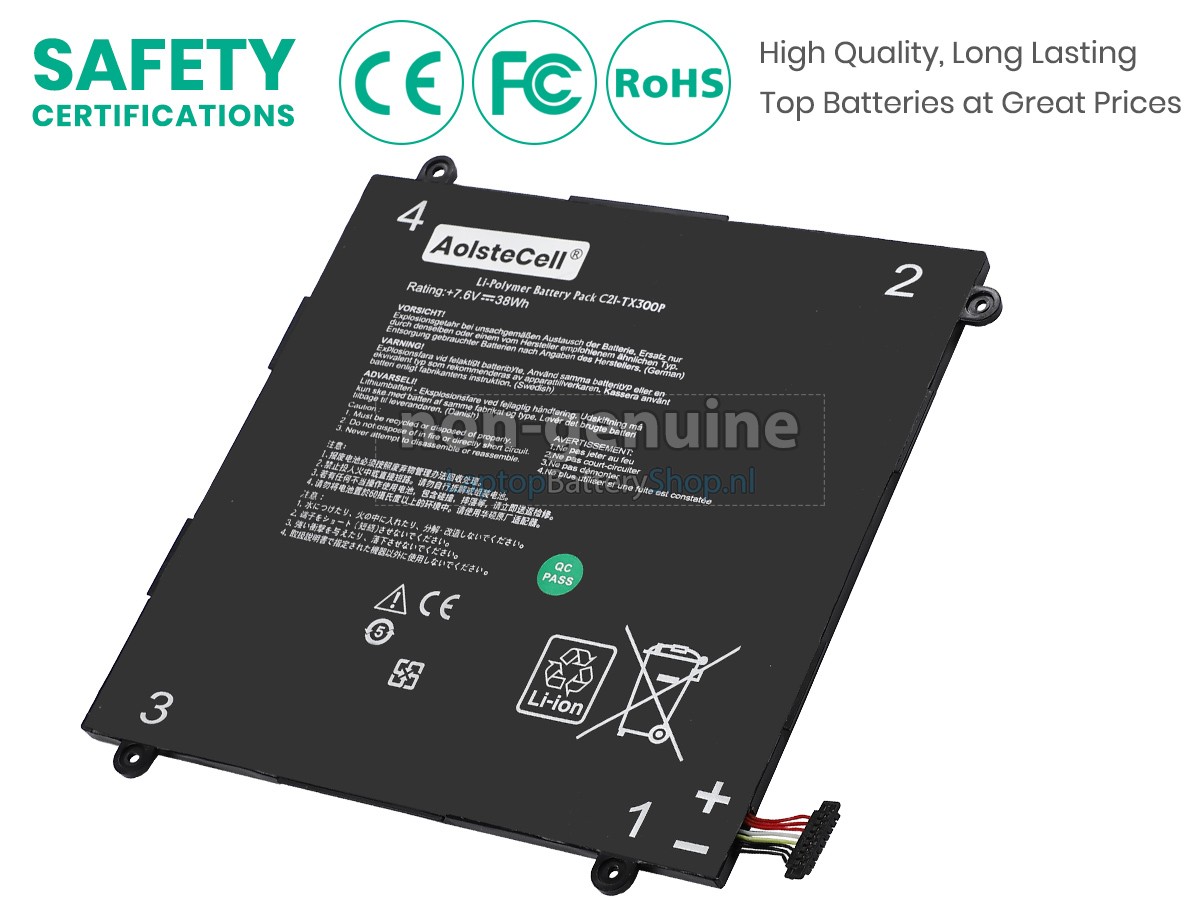 We have strict requirements on the product performance and safety. The Asus C21-TX300P battery must go through a series of rigorous quality inspections and safety tests. In addition, our Asus C21-TX300P replacement battery is sold directly on laptopbatteryshop.nl, so the price is about 20-50% lower than that of other middlemen and physical shops.