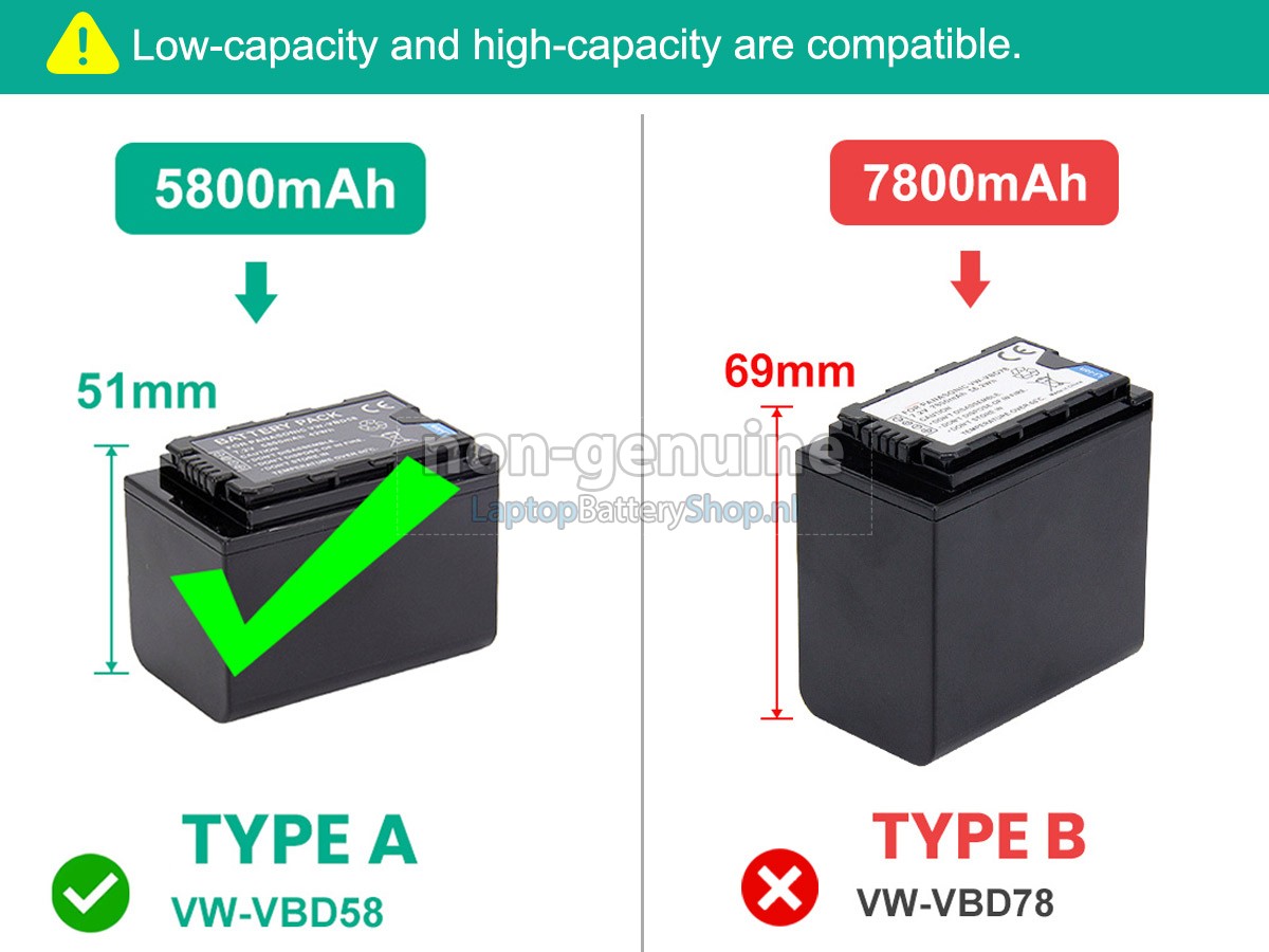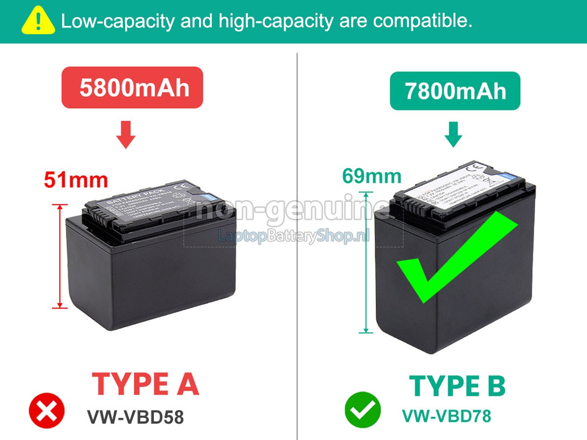 The long life Panasonic HC-X1500 battery contains Grade A battery cells to ensure longer battery life and more charge cycles. Fast Delivery, Easy Returns, and 100% Refund for 30 Days. VW-VBD58/78/has capacity and size differences, can be compatible with the use of larger capacity battery will have a part of the battery bulge.