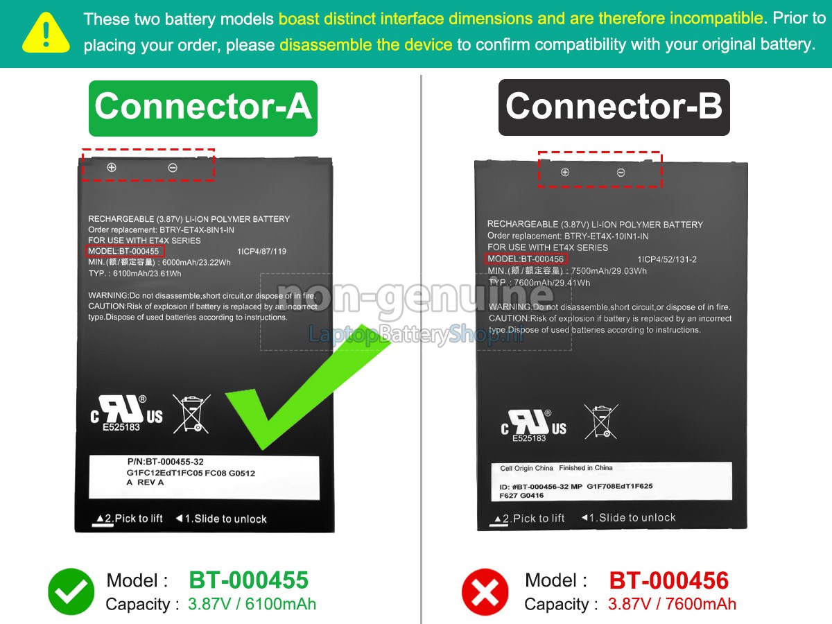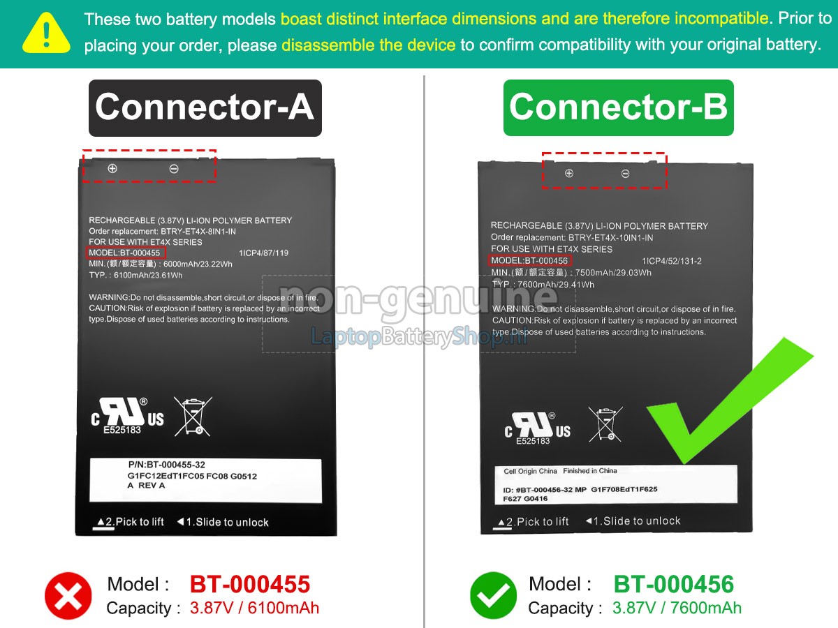Please check the model and shape of your Zebra ET45HC original battery(use Ctrl + F to search the model). Make sure you get the correct battery.